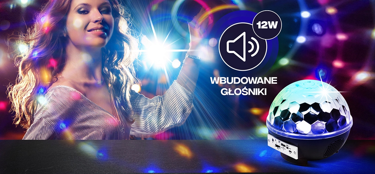 Dwa wbudowane głośniki o mocy 12W zapewniają czyste, mocne brzmienie, które bez problemu wypełni przestrzeń dźwiękiem. Synchronizator dźwięku automatycznie dopasowuje efekty świetlne do muzyki, co daje wrażenie pełnego połączenia dźwięku i efektów wizualnych. Każda piosenka staje się wizualnym spektaklem, a dzięki tym funkcjom Twoje imprezy będą miały wyjątkowy klimat i zapadną w pamięć wszystkim uczestnikom.