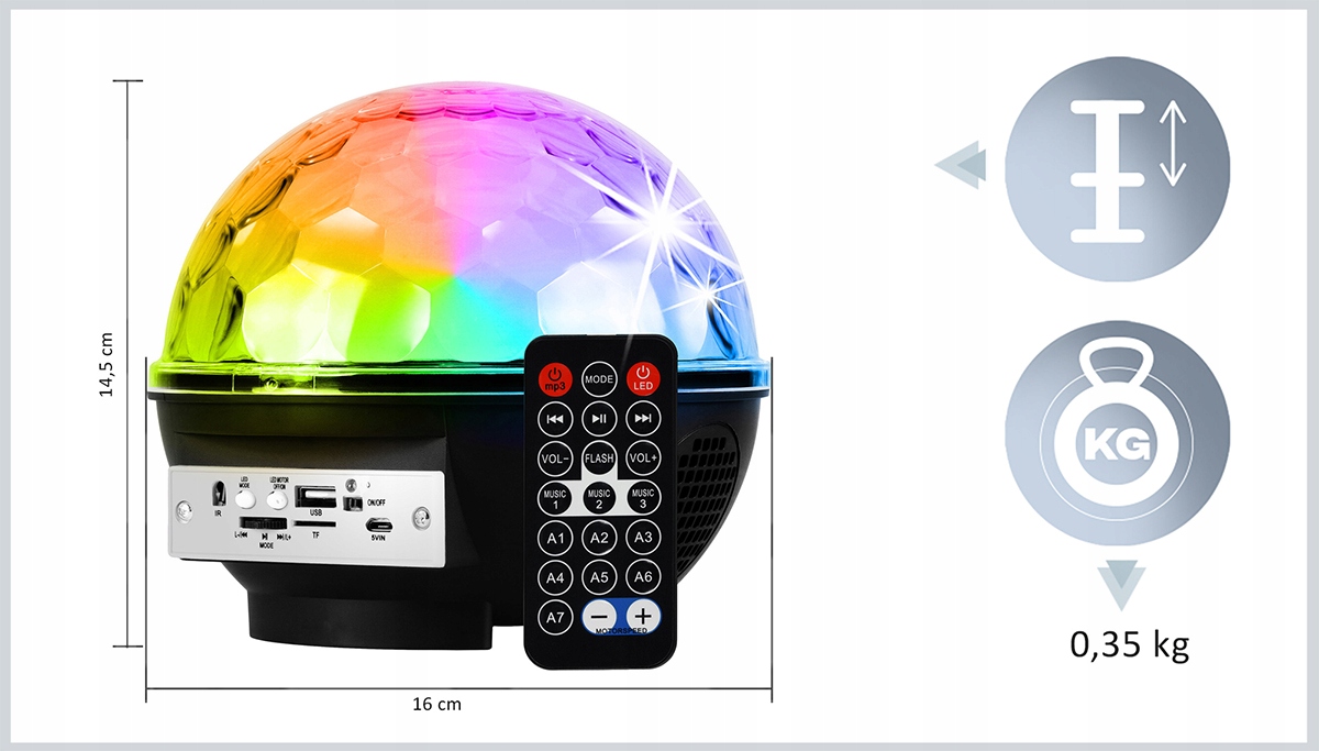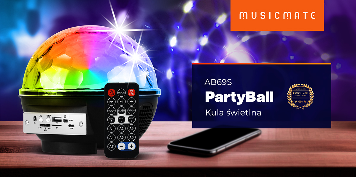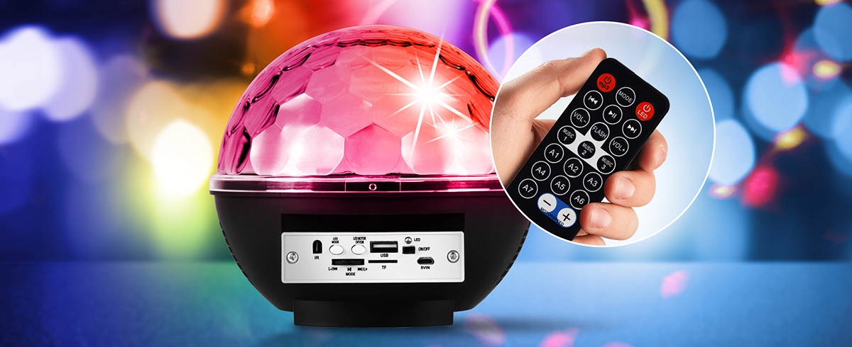 AB69S PartyBall posiada pilot zdalnego sterowania, który umożliwia pełną kontrolę nad urządzeniem. Możesz łatwo zmieniać kolory świateł, tryb dźwięku oraz prędkość obrotu, co pozwala na dostosowanie atmosfery do każdej sytuacji.