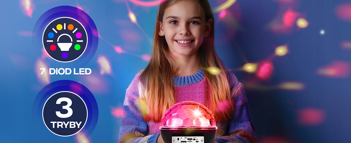 AB69S PartyBall wyposażony jest w 7 diod LED, które pozwalają na stworzenie różnorodnych, efektownych kombinacji kolorystycznych. Funkcja FLASH oraz 3 tryby muzyczne sprawiają, że światła automatycznie synchronizują się z muzyką, dostosowując się do jej rytmu. Dzięki regulowanej prędkości obrotów możesz dostosować dynamikę efektów do swojego nastroju, co tworzy energiczną, pełną emocji atmosferę, dopasowaną na różnorodne okazje.