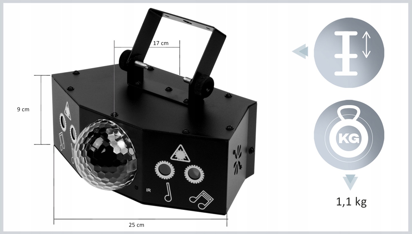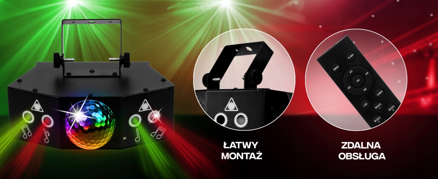 Multiefekt dyskotekowy 4Eye to profesjonalne, wszechstronne narzędzie, które ożywi każdą imprezę, idealne na wesela, eventy firmowe, domowe imprezy oraz inne wydarzenia wymagające wyjątkowej atmosfery. Wyposażony w 7 diod LED, w tym dwa efekty lasera czerwonego i dwa efekty lasera zielonego oferuje niesamowite efekty wyjściowe: magic ball, pattern, laser oraz flash. Obsługuje tryby pracy DMX512, master-slave, automatyczny oraz sterowany dźwiękiem, co pozwala na pełne dostosowanie do klimatu każdego wydarzenia. Multiefekt 4Eye zamieni każdą przestrzeń w rozświetlony, dynamiczny parkiet taneczny, tworząc niezapomnianą atmosferę. Moc urządzenia: 15W.