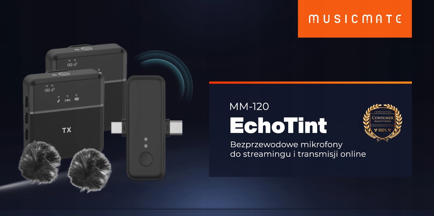 Bezprzewodowy mikrofon krawatowy MM-120 EchoTint to niezawodne narzędzie, które podniesie jakość Twoich nagrań na wyższy poziom. Idealny do transmisji LIVE, streamingu, wywiadów, prezentacji czy krótkich filmów typu VLOG, oferuje zasięg do 30 metrów, dając pełną swobodę działania.