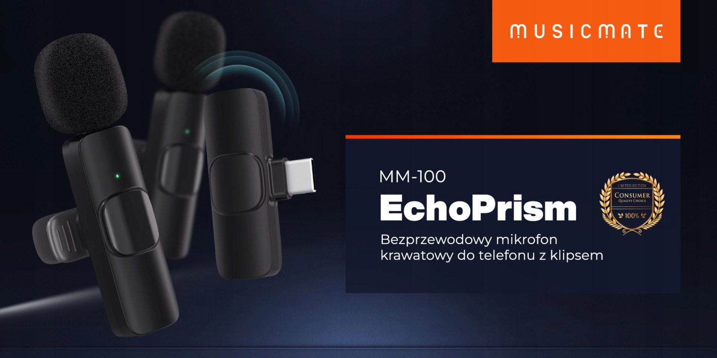 Bezprzewodowy mikrofon krawatowy MM-100 EchoPrism to urządzenie, które doskonale sprawdzi się w każdej sytuacji. Idealny do transmisji LIVE, streamingu, wywiadów, prezentacji czy krótkich filmów typu VLOG, pozwala na wygodne nagrywanie z doskonałą jakością dźwięku. Dzięki zasięgowi do 20 metrów, masz pełną swobodę ruchu podczas nagrywania.
